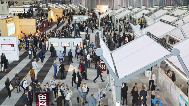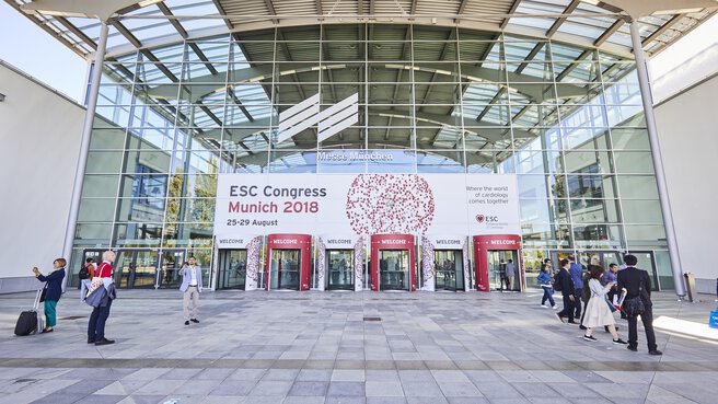 Im Jahr 2018 brachte der ESC 32.800 Herzmediziner:innen aus 150 Ländern nach München. Zusätzlich zum ICM nutzte der Großkongress weitere sechs direkt angeschlossene Hallen des Messegeländes. Neben der guten Verbindung zwischen ICM und den säulenfreien Messehallen, in denen Ausstellung, Poster-Area und Raumeinbauten umgesetzt wurden, war ein Highlight die grüne Oase, „das Atrium“, zur Erholung der Kongressteilnehmer:innen. Die klare Aufplanung machte es den Kongressteilnehmerr:innen leicht, sich auf dem Gelände zu orientieren.