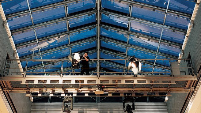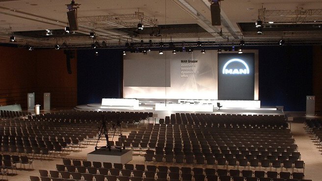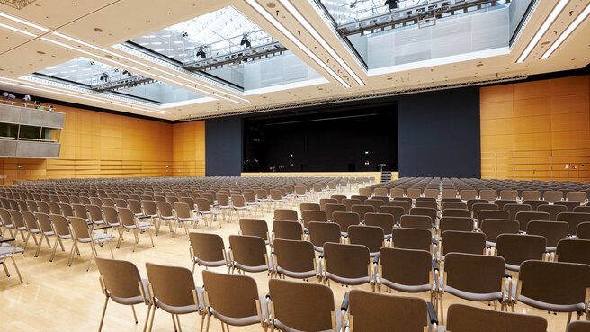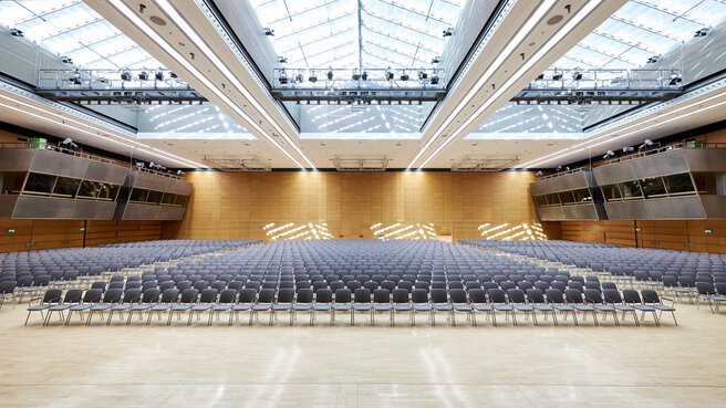 Unser Saal 14b bietet Ihnen in der großen Variante 1.565 m² und eine Kapazität von 1.482 Sitzplätzen in Reihenbestuhlung, 784 parlamentarischen Sitzen oder 826 Plätzen in Bankettform. Der Saal erhält durch vier Lichtkuppeln Tageslicht, auf Wunsch können wir ihn komplett verdunkeln. Dieser Saal eignet sich besonders für Ihre Kongresse, Produktpräsentationen, Shows und Events bis zu 1.482 Gästen.