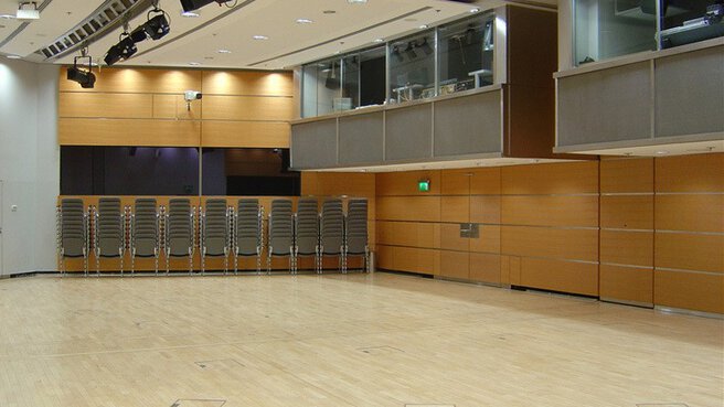 Unser Saal 4 ist ein in der Längsachse teilbarer Saal mit parallelen Einrichtungen. Der gesamte Saal bietet auf 200 m² eine Kapazität von 202 Sitzplätzen in Reihenbestuhlung, 96 parlamentarischen Sitzen oder 112 Bankettplätzen. Der Saal 4 eignet sich ideal für kleinere Präsentationen oder Gruppenarbeiten für bis zu 202 Gästen. Durch seine Lage im Erdgeschoss bietet er sich in Verbindung mit dem Foyer auch als zusätzlicher Cateringbereich an.