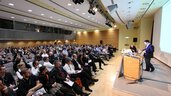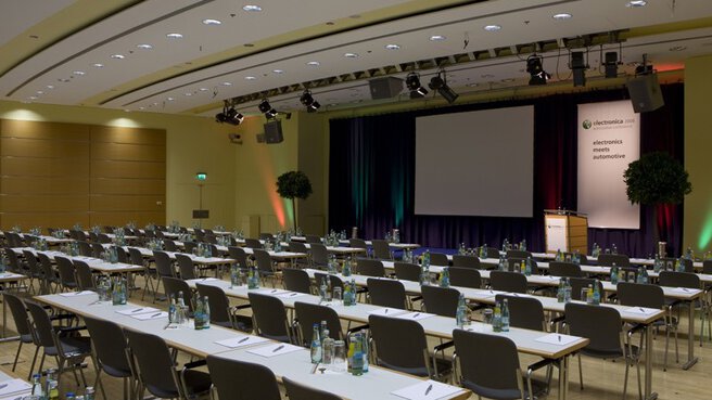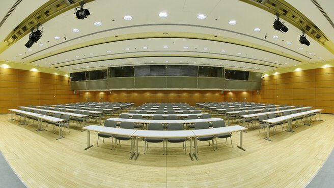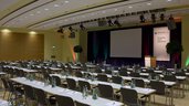 Unser Saal 5 liegt im Erdgeschoss. Er bietet Ihnen mit 390 m² eine Kapazität von 413 Sitzplätzen in Reihe, 198 parlamentarischen Sitzen oder 196 Bankettplätzen. Das Bühnenpodest ist fest installiert und bietet großen Gestaltungsfreiraum. Dank fest installierter Medientechnik können Sie Bild und Ton in die Nebensäle übertragen. Der Saal 5 ist besonders geeignet für Ihre Konferenzen, Tagungen und Präsentationen bis zu 413 Gästen. Alternativ kann dieser Saal als Catering-Bereich für ca. 200 Gäste dienen.