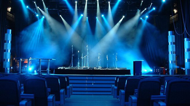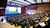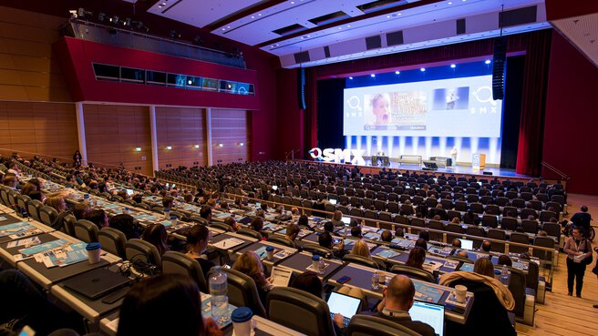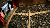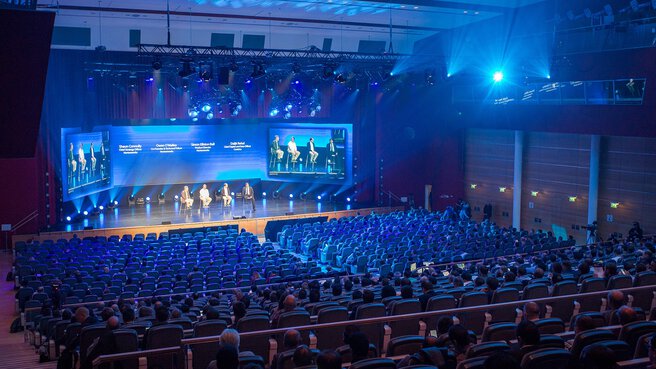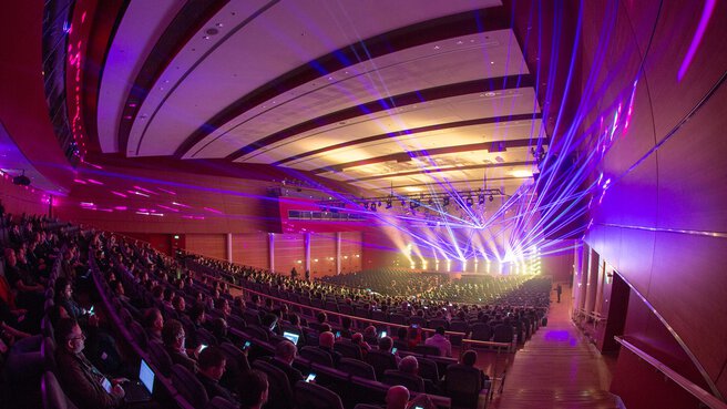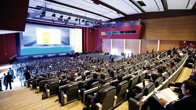 Room 1 with an auditorium with ascending rows of seats and a large-scale stage area of 277 square meters is ideal for on-stage events such as conventions, opening ceremonies and fashion shows. Hall 1 seats up to 1,430 people. Every other row of seats can be converted into tables, creating classroom seating for up to 746 people. The stage is adjustable in height, can be extended with a catwalk. The full-sized cinema-quality projection screen measures 14 x 15 m.