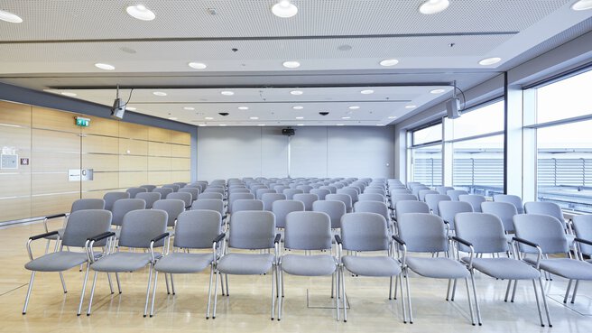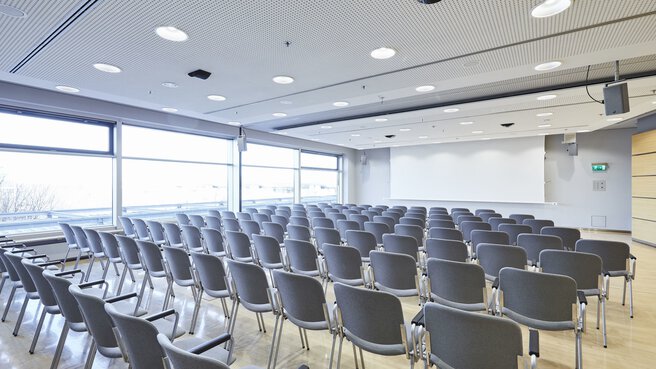 This room on the second floor is suitable for small lectures, presentations, meetings and workgroup sessions. It has 130 square meters of space and can accommodate 125 people in theater seating, 68 people with classroom seating or 72 people with banquet seating. Other seating alternatives are also possible, but require authorization from the fire department. This room can also be partitioned to form two smaller rooms. Standard features include media equipment—some portable, some permanently installed—lighting and direct media connections to other rooms.